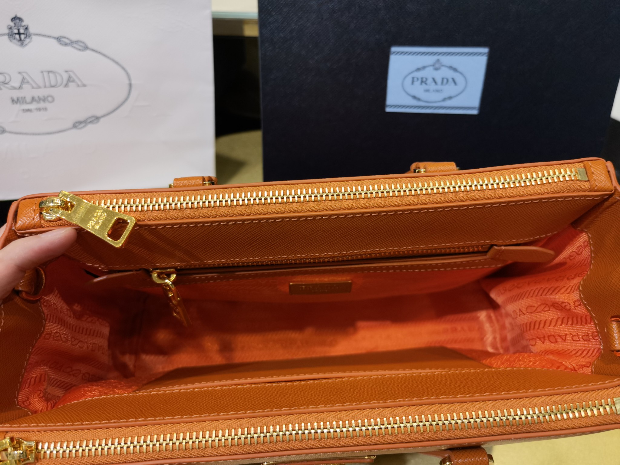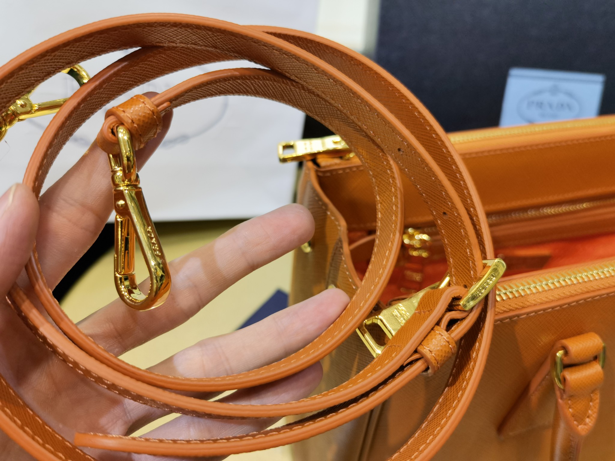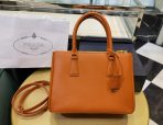This is a replica Prada Galleria 1BA863 medium leather bag. ,Leather handles,Detachable, adjustable leather shoulder strap. Max. length: 120 cm – Min. length: 110 cm – Max. drop length: 60 cm – Min. drop length: 55 cm,Removable leather key ring,External zipper pockets,Metal hardware,Leather triangle with metal lettering logo on the front,Snap closure on the sides,Logo-print nylon lining with two pockets, including one with zipper,With purse feet,Height: 19.5cm,Width: 28cm,Length: 12cm