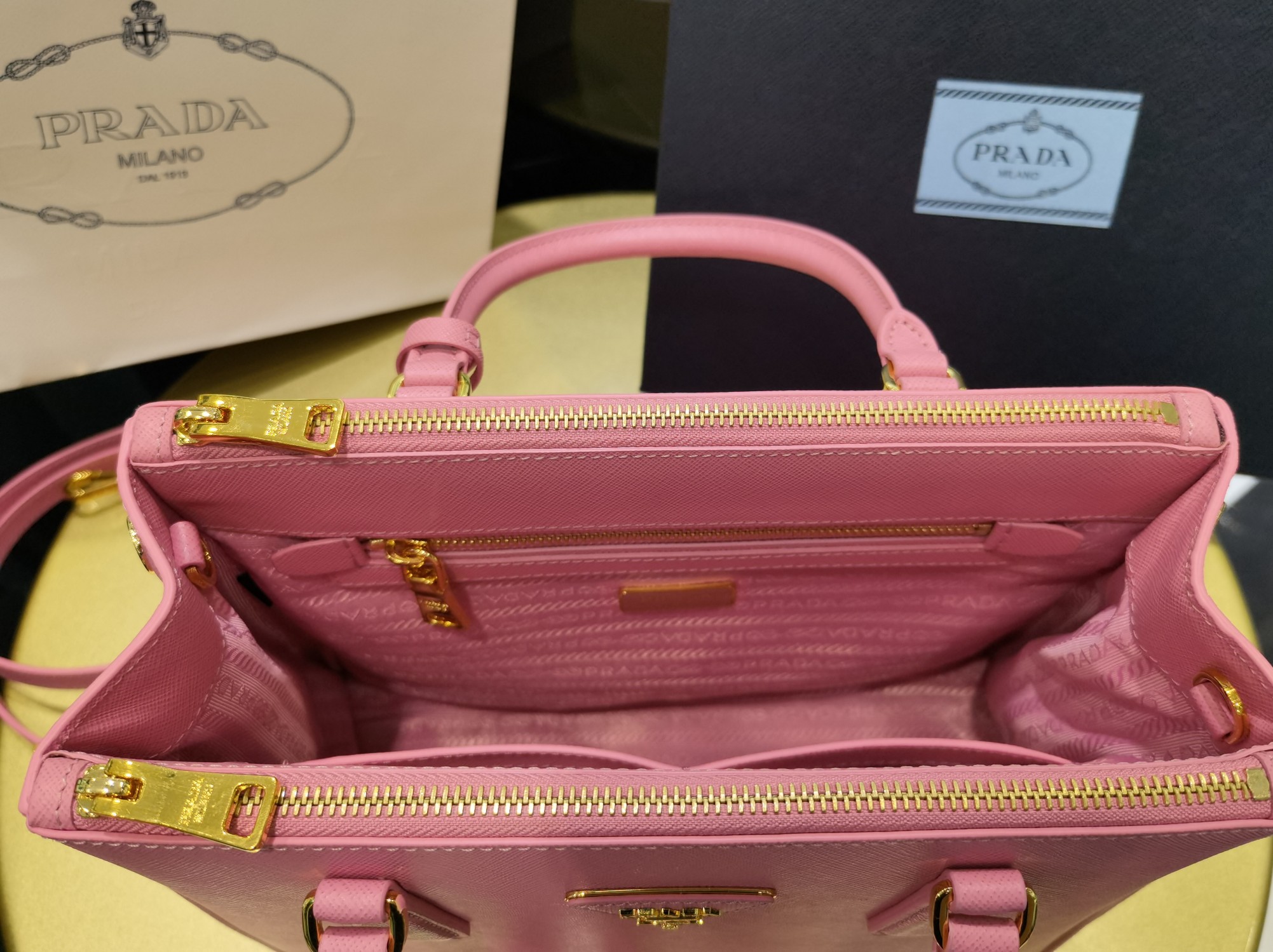 This is a replica Prada Galleria 1BA863 medium leather bag. ,Leather handles,Detachable, adjustable leather shoulder strap. Max. length: 120 cm – Min. length: 110 cm – Max. drop length: 60 cm – Min. drop length: 55 cm,Removable leather key ring,External zipper pockets,Metal hardware,Leather triangle with metal lettering logo on the front,Snap closure on the sides,Logo-print nylon lining with two pockets, including one with zipper,With purse feet,Height: 19.5cm,Width: 28cm,Length: 12cm