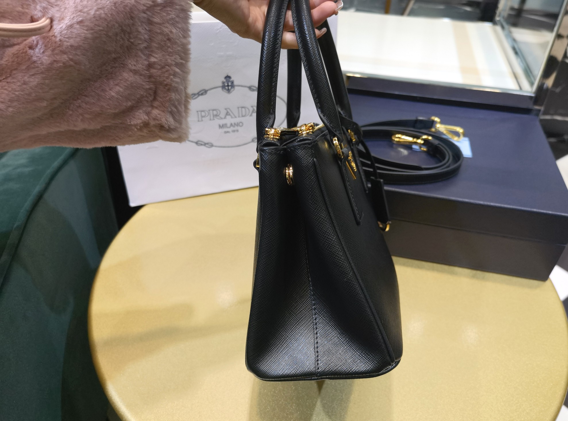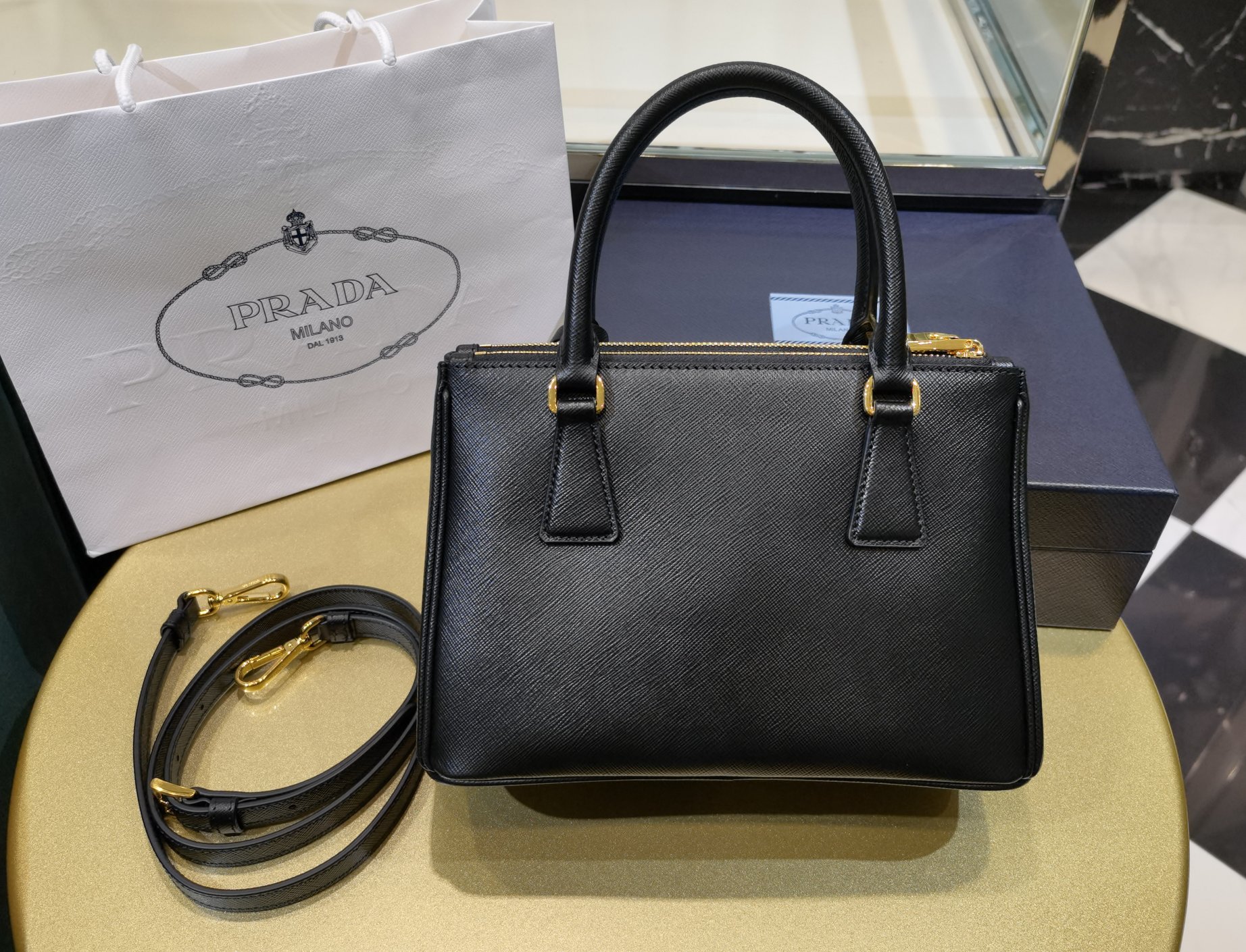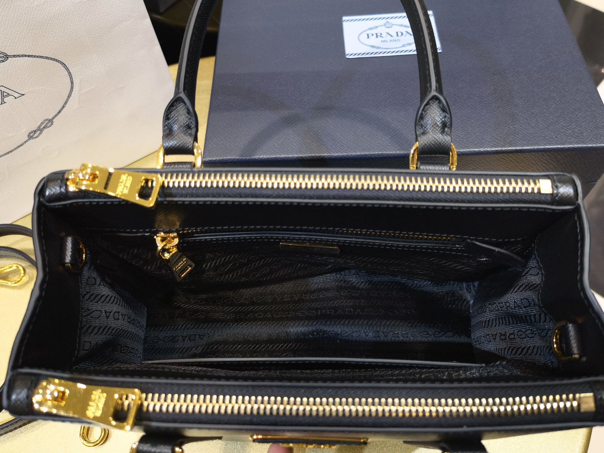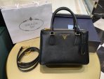 This is a replica Prada Galleria 1BA896 small leather bag. ,Leather handles,Detachable, adjustable leather shoulder strap. Max. length: 120 cm – Min. length: 110 cm – Max. drop length: 60 cm – Min. drop length: 55 cm,Removable leather key ring,External zipper pockets,Metal hardware,Leather triangle with metal lettering logo on the front,Snap closure on the sides,Logo-print nylon lining with two pockets, including one with zipper,With purse feet,Height: 16.5cm,Width: 24.5cm,Length: 11cm