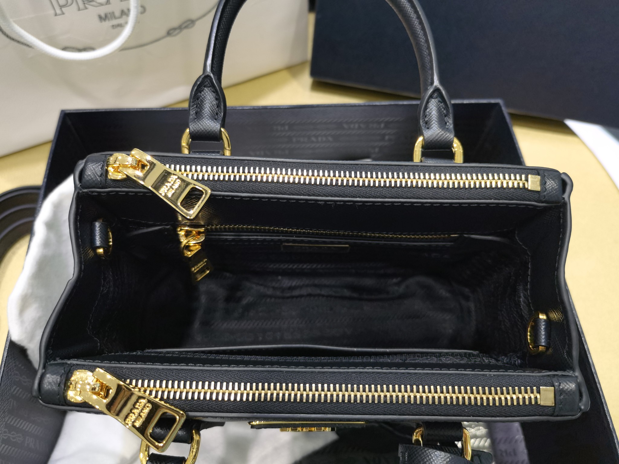 This is a replica Prada Galleria 1BA906 Saffiano leather mini-bag. ,Leather handles,Detachable, adjustable leather shoulder strap. Max. length: 120 cm – Min. length: 110 cm – Max. drop length: 60 cm – Min. drop length: 55 cm,Removable leather key ring,External zipper pockets,Metal hardware,Leather triangle with metal lettering logo on the front,Snap closure on the sides,Logo-print nylon lining with two pockets, including one with zipper,With purse feet,Height: 14.5cm,Width: 20cm,Length: 9.5cm