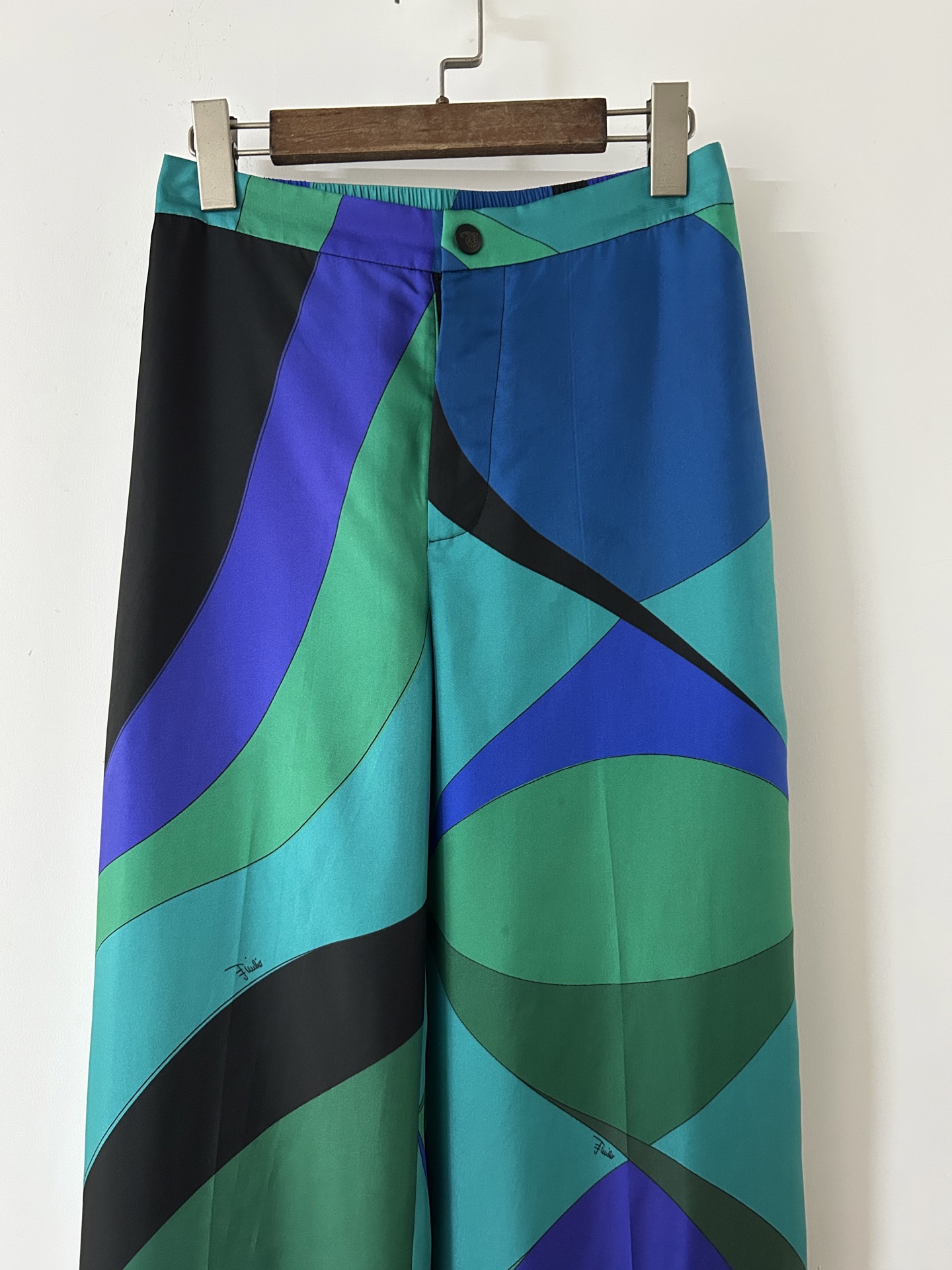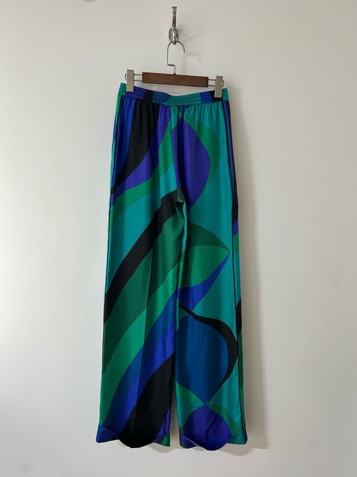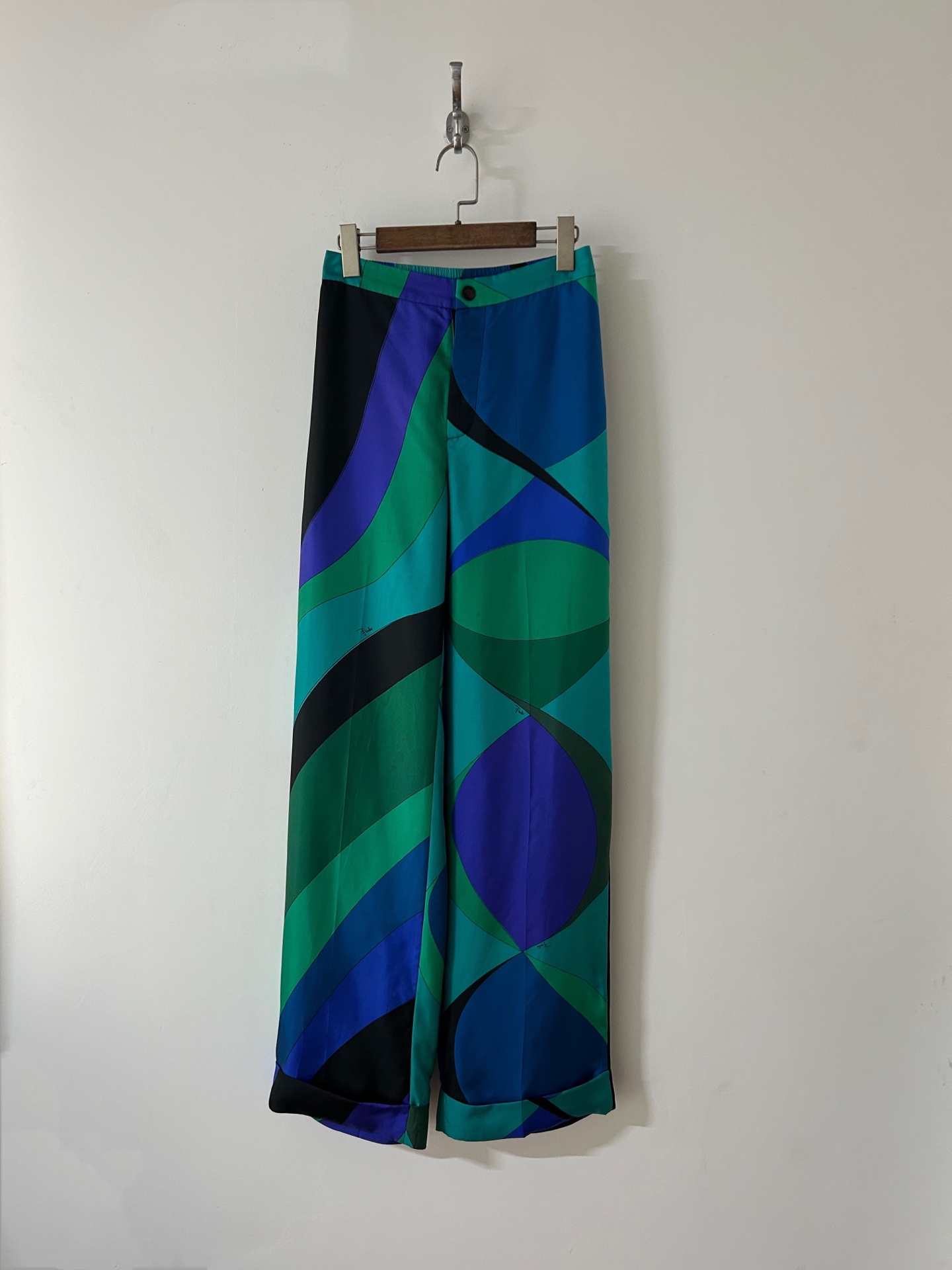 Be the first to review “PUCCI green blue swirl print silk trousers”