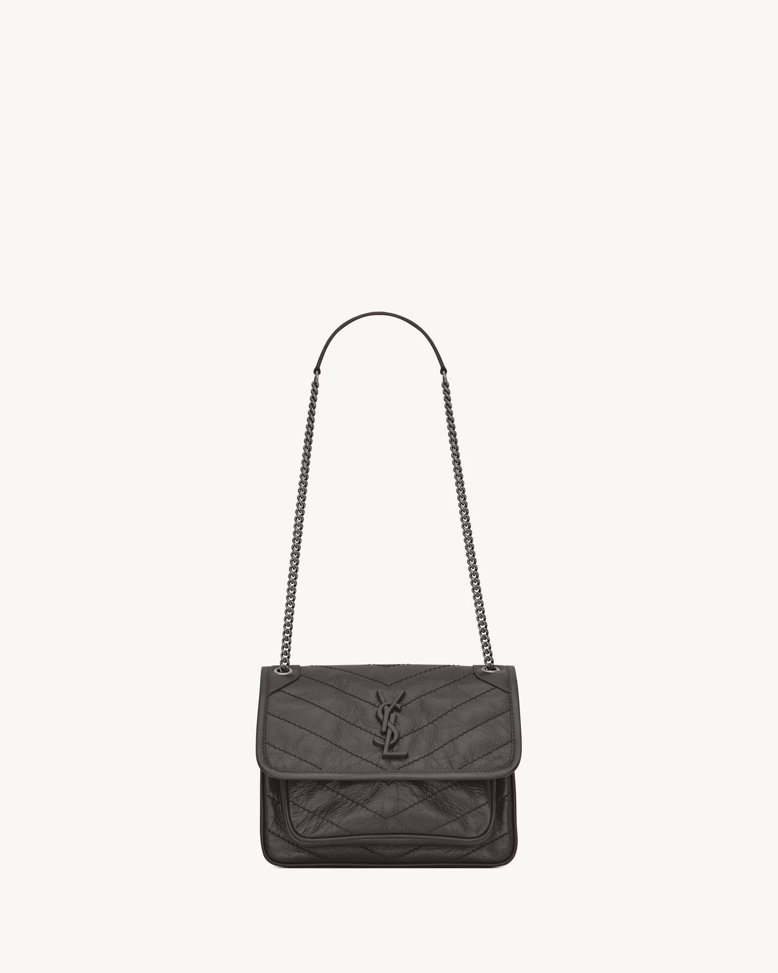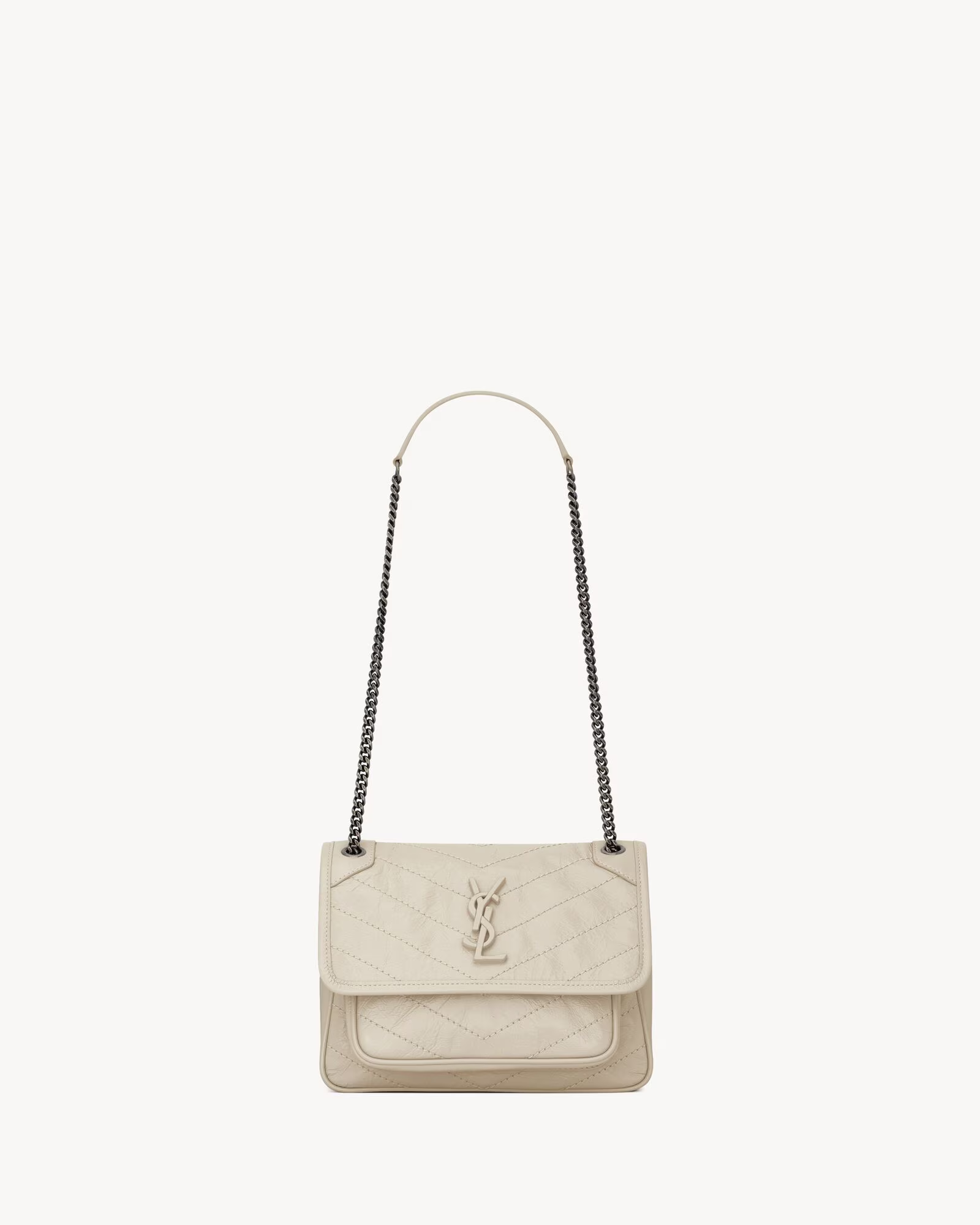 This is an replica SAINT LAURENT NIKI baby in vintage leather.,FLAP BAG IN VINTAGE CALF LEATHER, FEATURING CHEVRON QUILT OVERSTITCHING AND LEATHER-ENCASED CASSANDRE.,LIGHT, WITH TWO COMPARTMENTS AND A LARGE BACK SLOT POCKET.,FEATURES A SLIDING CHAIN STRAP THAT CAN BE WORN ON THE SHOULDER OR CROSSBODY.,